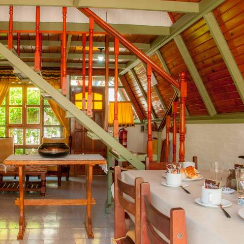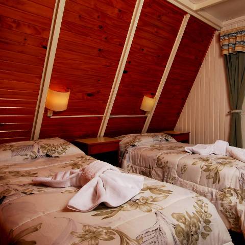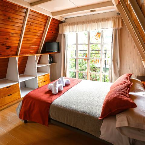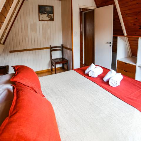 Las cabañas están desarrolladas en dos niveles, con ambientes comunes en planta baja y dos dormitorios en planta alta, con ventanales luminosos, y amplios espacios.